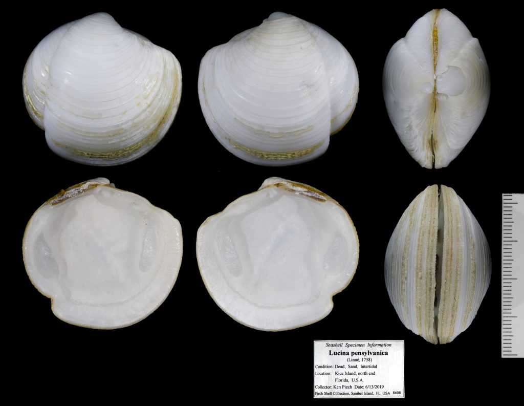Read MoreShell size to 85 mm; shell circular, compressed. Sculpture of radial lines crossed by finer concentric threads. Lunule deep, heart-shaped, larger on right valve. Periostracum thin, brownish. Color white, margins often pink internally. This is a common species in the tropical Western Atlantic, including the East Coast of Florida and the Florida Keys. Although there is a good record from Kice Island (collected by Amy Tripp in 2011), the few records of the species for Sanibel present in the Museum collection are most likely cases of mislabeled locality data.