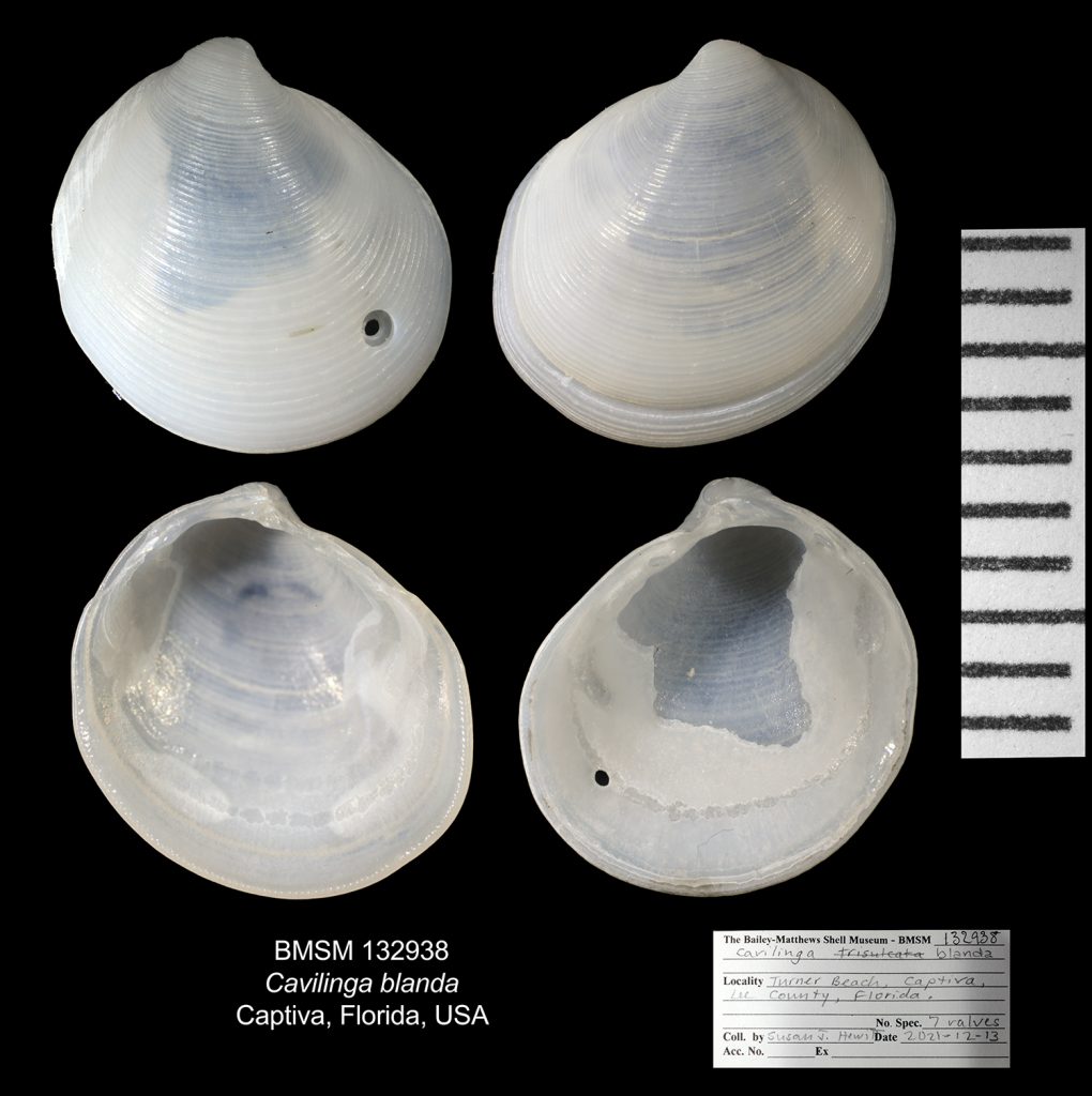 Shell size to 9 mm; shell oblique-oval, beaks pointing anteriorly, sculpture of fine commarginal lines. Shell margin finely serrated. Internal lining of valves sometimes "delaminated." Color off-white to cream-white. Shells in photos were collected by Susan J. Hewitt, loose valves in the main image from Turner Beach on Captiva, in December 2021, the valve in second image on Blind Pass, Sanibel, in December 2014.