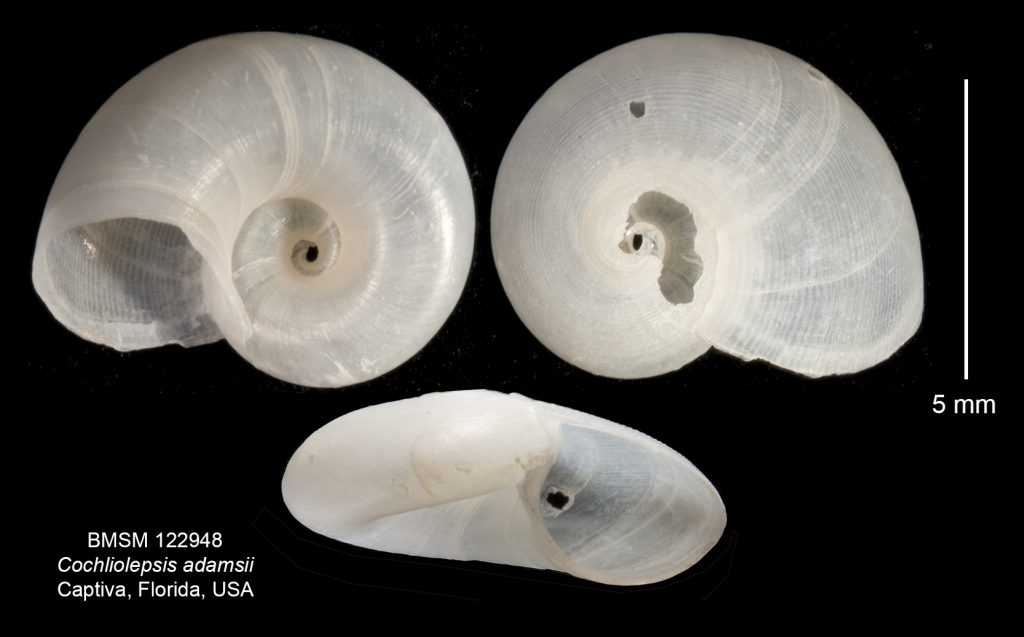 Read MoreShell size to 8 Shape discoidal, flattened, with a sculpture of fine spiral lines. Aperture prosocline, external lip thin, umbilical opening spacious, umbilical callus lacking. This shell in the main image (BMSM 122948) was collected in 2017 on Turner Beach, Captiva, by Susan Hewitt.