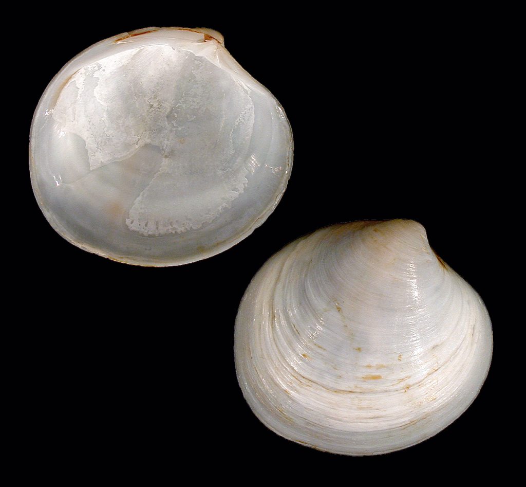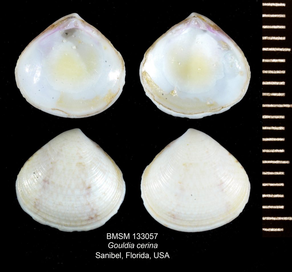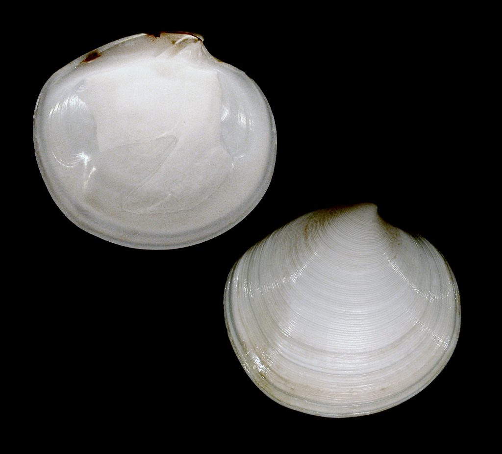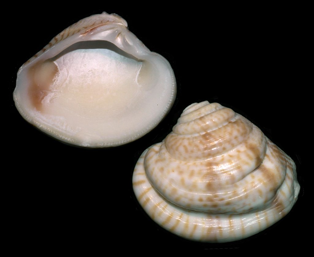 Shell size to 35 mm; shell very thick, solid, with 5-9 concentric ribs rounded or slightly flattened in cross-section. Shell triangular, with postero-dorsal margin straight. Color cream, with rose or light-brown mottlings. Species lives in deeper water in the Gulf of Mexico and in shallower areas in the Gulf and the Caribbean; it is very rare on the beaches of SW Florida. The left valve illustrated was found by Kimberly Nealon on Captiva, on Easter Sunday, April 20, 2014; its presence on the beach most likely resulted from the late-2013 beach renourishment project. The picture on the bottom is an inverted image of the same left valve as in the other view. This is Lirophora latilirata (Conrad, 1841) of other authors. This latter taxon, however, is strictly a Miocene fossil species.
